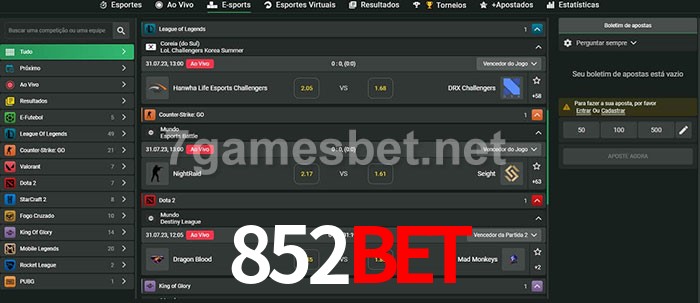 O 852Bet oferece uma grande seleção de opções de apostas em e-sports com probabilidades competitivas